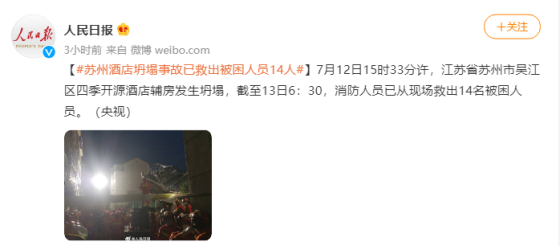 7月12日15时33分许,江苏省苏州市吴江区四季开源酒店辅房发生坍塌,截至13日6:30,消防人员已从现场救出14名被困人员。来源:人民日报微博