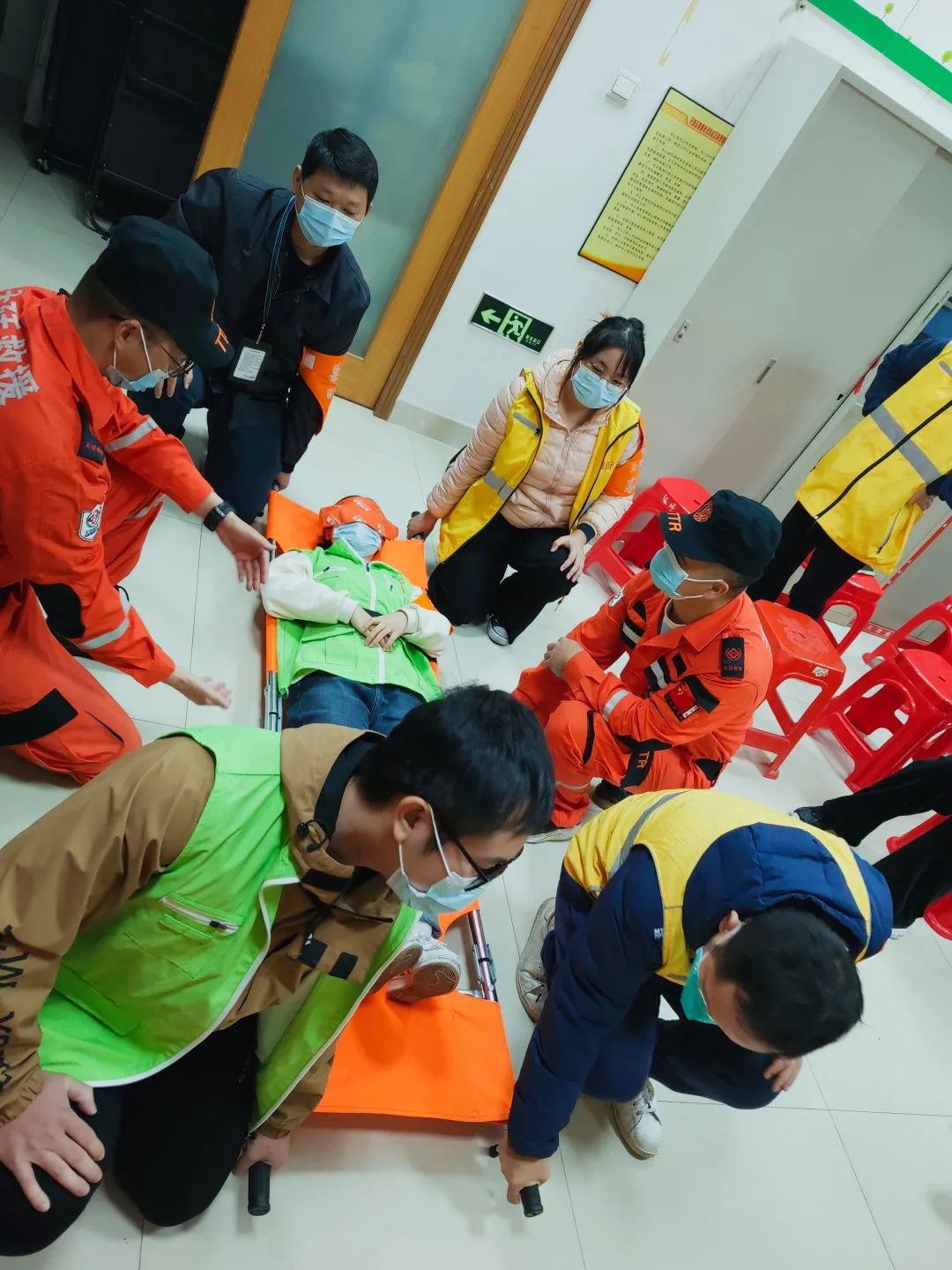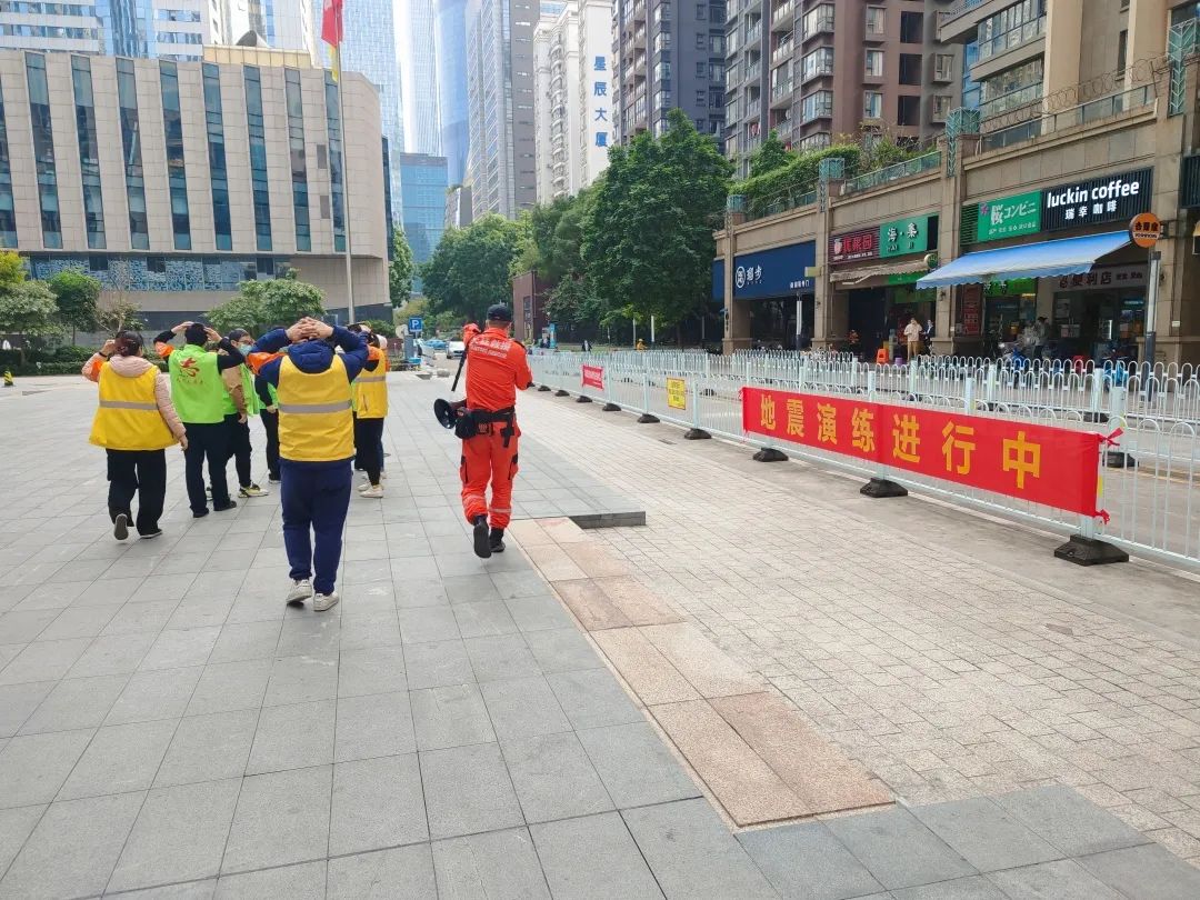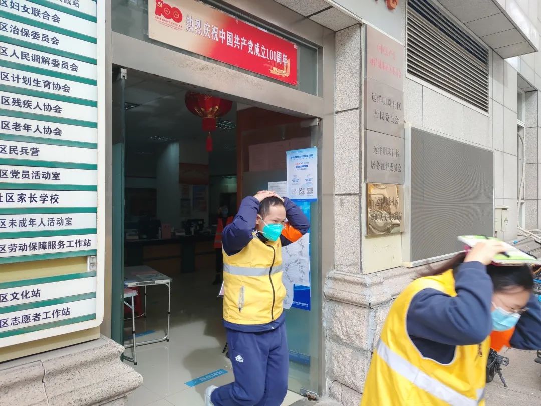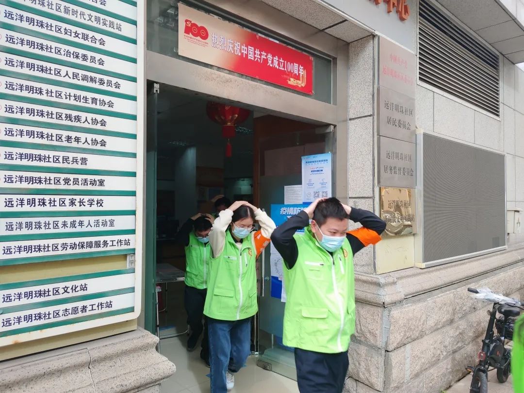 随后模拟突发地震,社工立刻拿起身边物品或用手护住头部,弯腰低身,按疏散路线迅速有序地撤离到安全地带。